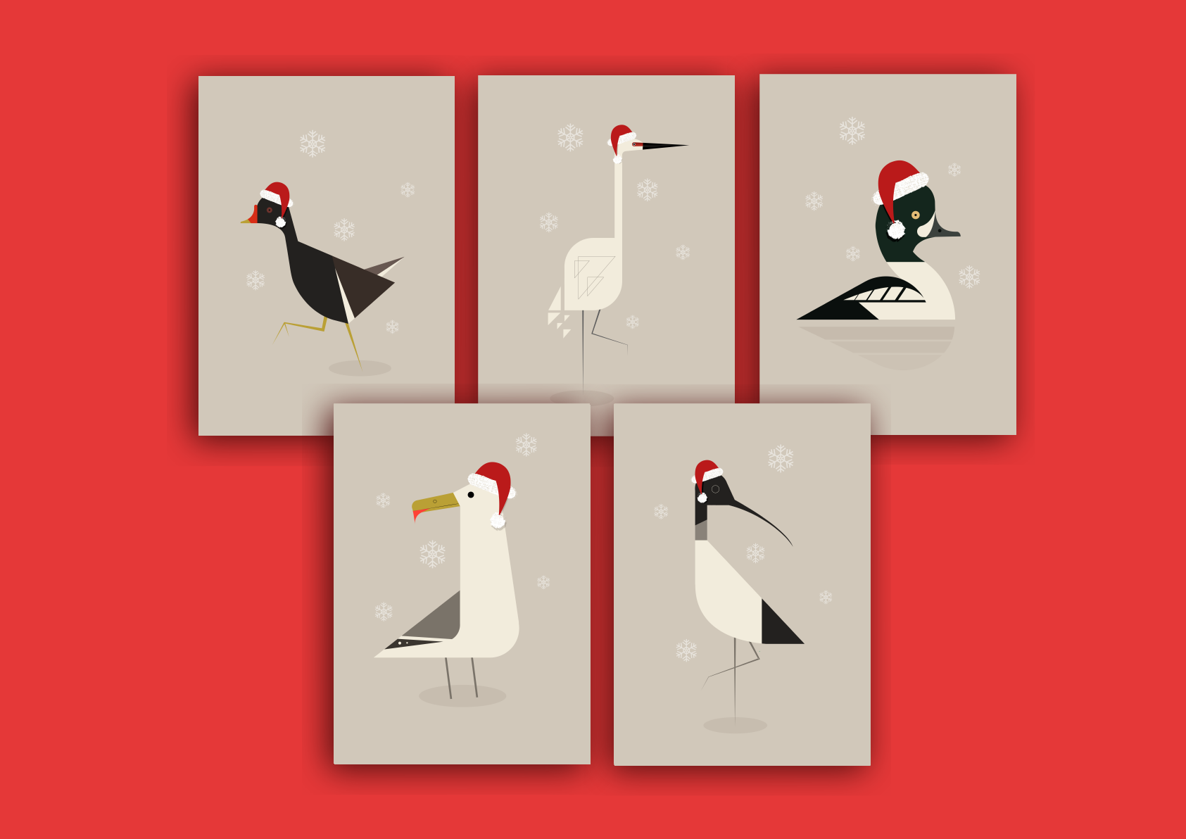 Designs include: Moorhen, Egret, Goldeneye, Herring Gull, Ibis all getting into the Christmas spirit by donning a Santa hat in the snow